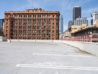 A concrete parking deck in Los Angeles, California under a clear sky. Open urban space featuring classic architecture and city roads, capturing a day in the vibrant concrete landscape of Los Angeles.