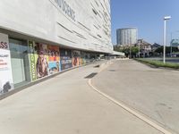 This is an image of a modern office building in downtown Dallas. The clear sky provides a stunning backdrop for the architecture and concrete streets. The road surface and walkways are lined with asphalt and curbs, creating a pedestrian-friendly environment. The city's business district is bustling with activity, as people go about their day in this metropolitan area. The building also features advertising for businesses and a museum. This photo captures the essence of urban life in Dallas, showcasing the blend of modern architecture and public spaces that make this city unique.