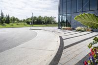 This is an image of a modern cityscape in Toronto, Canada. The photo showcases the architecture and urban design of the city, with tall buildings and concrete walkways. The road surface and parking lot add to the urban atmosphere. Lush trees and leaves provide a touch of nature amidst the urban landscape. The clear day sky contrasts with the clouds, creating a vibrant backdrop. This photo captures the vibrancy of city life in Toronto, showcasing the intersection of architecture, nature, and public space.