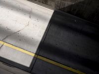 This image captures an impressive architectural structure in Berlin, Germany. The photo shows an elevated concrete street with yellow and white markings. The sunlight casts hard shadows on the road surface, creating an abstract pattern. The building's top-down view highlights the high walls and entrance/exit ramps. This urban infrastructure represents the city's modern design and efficient transportation system. The black and metal elements add a sleek and industrial touch to the overall aesthetic. This photo showcases the intersection of art, architecture, and urban planning in Berlin, making it a perfect representation of the city's unique character.