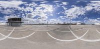 a 360 camera image showing the reflection of clouds and blue sky in a skateboard park