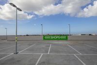 A sunny day in the city with open concrete streets and parking lots. The road surface is smooth and shaded by cumulus clouds. Street lights illuminate the asphalt and gas stations along the way.
