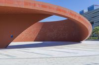 This image captures the vibrant cityscape of Suzhou, China with its modern architecture and open spaces. The buildings showcase a futuristic design with composite materials, metal walls, and concrete structures. The blue sky provides a clear backdrop for the striking red and orange colors of the buildings. The urban design and structural elements create an artful composition. This photo represents the dynamic city life and vacation vibes in Suzhou. It is a perfect depiction of the modern and innovative architecture that defines the city.