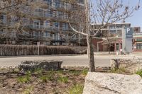 This image captures the intersection of a busy urban street in Toronto, Ontario, Canada. A tree is seen growing on the corner, adding a touch of nature to the concrete surroundings. The large building in the background stands tall against the clear sky. The road, curb, and parking lot are visible, showcasing the urban design and infrastructure of the neighborhood. This photo represents a typical day in Toronto, where the natural elements blend harmoniously with the urban landscape.