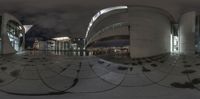 an exterior at night with reflective circular metal objects surrounding the walkway and walkways, and a cloudy sky above the roof