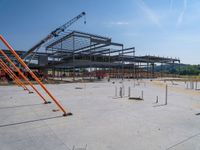 Construction site with concrete and steel frameworks under a clear sky. The sunny day highlights the progress being made with the building. Surfaces prepared for future development.