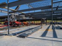 This image showcases a large warehouse under construction, with the focus on the foreground where construction equipment and a crane can be seen. The concrete surface of the warehouse and the surrounding area creates a hard shadow, indicating it is daytime. A worker can be seen carrying out work on top of the building. The photo represents a construction site in progress, with the warehouse being one quarter completed. This image captures the activity and progress involved in the construction industry.