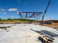 a construction site with a large metal structure and a crane in the background on a sunny day