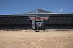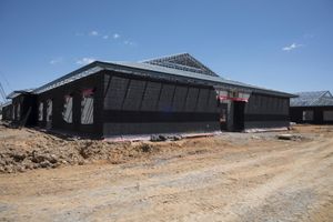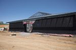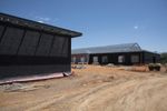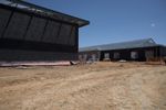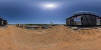 A small construction site in the desert with a fish eye lens view. The clear sky and mountain range provide a scenic backdrop, while the structure and building materials indicate ongoing development in the rural area.
