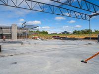 a steel frame structure stands still as construction continues on an adjacent industrial building and truck yard