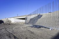 This stock photo showcases construction work taking place at the corner of an underpass under a highway bridge in the beautiful California desert. The image captures the architectural details of the road and bridge amidst the sandy landscape and open space. The sunlight highlights the facade of the structure as workers continue the construction process. In the background, the mountain range of the Alps adds to the picturesque scenery. This industrial scene emphasizes transportation and the connection between different locations. The concrete bridge and tire tracks on the gravel create an interesting visual contrast. The image also represents a winter setting with hint of snow in Orange County, USA.