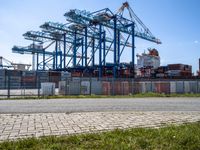 Container ships are docked at the Bremerhafen container port in Bremen, Germany. The sunny day showcases the clear sky and the water's edge where the ships are located. The industrial setting includes buildings, factories, and composite materials. The urban design features an asphalt road, grass, vegetation, and a fence surrounding the land lot. Overhead power lines and transmission towers provide electricity to the pier and jetty. This image captures the bustling harbor atmosphere of the city, which is located in Europe. The container port serves as an important hub for transportation and trade, contributing to the bustling economy of Bremen. Additionally, gas facilities can be observed in the vicinity, highlighting the industrial nature of the area.
