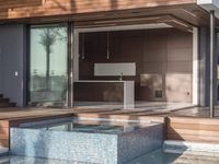 Modern architect-designed villa in Los Angeles, California. The kitchen floats in the swimming pool, surrounded by wood walls and glass facades. The interior design showcases a wood floor and ceiling. A perfect day to enjoy the picturesque backyard.