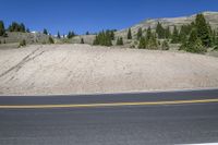 A scenic road in Colorado's Cottonwood Pass, surrounded by breathtaking mountain landscapes and lush vegetation. The asphalt road gently slopes through the picturesque Crested Butte area under a clear sky.