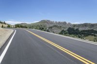 Scenic mountain landscape in Colorado, USA. An asphalt road winds through the rugged terrain, with clear skies above. Vegetation lines the road, leading the eye towards the majestic mountain in the distance.