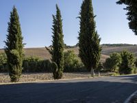 a group of trees line the road by a country road, along with some rolling hills in the background