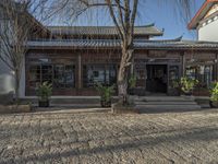 This stock photo features a charming courtyard in China, set outside an older building. The cobblestone pathway adds to the historic architecture of the town. A lush tree stands in front of the building, providing shade and adding a touch of nature to the scene. The residential area surrounding the courtyard is quiet and peaceful. The image captures the essence of a serene spring day in this old village in China's Yunnan province. This photo is perfect for showcasing real estate properties, hotels, restaurants, or any businesses with an interest in urban design and classic architecture.