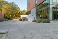 the courtyard features concrete, plants and a fire hydrant surrounded by trees and glass windows