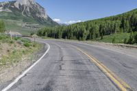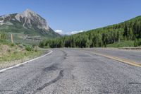 This is an image of a road surrounded by a beautiful landscape in Crested Butte, Colorado, USA. The road surface is made of asphalt, leading straight down the road. The clear sky above highlights the forest and mountains in the distance. The vegetation along the road adds to the natural beauty of the scene. This photo represents a peaceful day in nature, capturing the essence of Crested Butte.