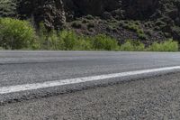 a lone motorcycle is on an empty road near rocks and mountains at a distance and trees all around