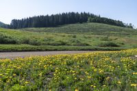 This image captures a picturesque landscape in Crested Butte, Colorado, USA. The open field is filled with lush vegetation, including trees and flowers. The scene is viewed from the side of a dirt road that leads into the forested mountains in the distance. The clear sky overhead adds to the beauty of the scenery. It reflects the perfect conditions for outdoor activities and recreational pursuits. This photo represents the natural beauty and serenity of Washington Gulch in Crested Butte, Colorado.