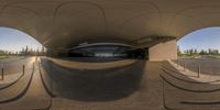 A curved building with a walkway leading to an outdoor parking lot. The modern architecture and clean lines create a striking visual against the clear sky. The curved walkway adds an interesting design element to the urban space.