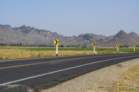 This stock photo features a scenic landscape with a single lane road curving through a rural area. The road is made of asphalt and has yellow and white signs indicating directions. In the distance, there are majestic mountains, and the sky is clear. The road is surrounded by green grass, trees, and fields, creating a beautiful nature scene. The road surface is well-maintained, and there is a grass surface on the sides. This road is located in Thailand, providing a glimpse of the country's rural and picturesque countryside.