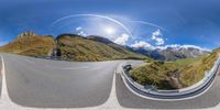 360 - pan photo of curved mountain road taken from camera angle with sun shining through clouds