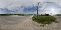 A curved road with lush vegetation on the side. The fisheye lens captures the beautiful coastal landscape in the background, with the ocean and yellow dawn sky. Power lines and infrastructure add to the scenic view.