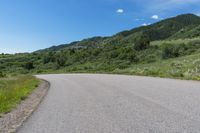 This stunning stock photo features a scenic curved road running through the mountains of Deer Creek Canyon Park in Colorado. The road is made of smooth asphalt and is surrounded by lush vegetation on both sides. The bright blue sky overhead creates a beautiful contrast against the green landscape. The day is clear, allowing for a breathtaking view straight down the road. The photo captures the natural beauty and tranquility of this picturesque location in Denver, Colorado.