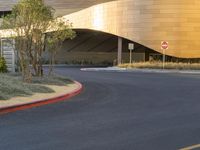 A curved road in Las Vegas, Nevada, surrounded by modern architecture. Shadows from the early morning dawn create a dramatic contrast. Stop sign and yellow building add a pop of color to the urban landscape.