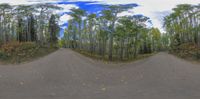 A scenic road through a lush temperate forest. The road curves gracefully, surrounded by green vegetation and towering trees. Sunlight filters through the branches, creating a magical atmosphere. A perfect spot for a recreational day in nature.