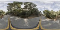 a curved road near some trees and trees that are standing up above each other in a panoramic image