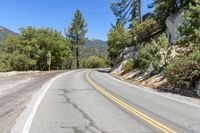 A picturesque road in California winds through a rocky mountain landscape. Lush green trees line the path as it curves gracefully. The clear sky and rural setting create a serene and natural atmosphere.