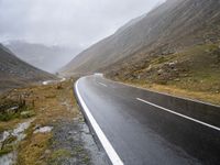 This is an image of a winding road in Austria, surrounded by the beautiful landscape of mountains and water. The asphalt road curves through the gloomy and wet European scenery. The grey sky and clouds add to the moody atmosphere, creating a sense of the day's gloominess. This picture captures the natural beauty of Austria, where roads blend seamlessly with nature. Experience the tranquility and serenity of this European landscape as you drive along this wet and rainy road.