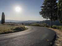 A picturesque view of a curving road in the beautiful region of Tuscany, Italy. The road is surrounded by a rugged mountain side, with large trees in the foreground. The sun is rising, casting a warm light on the landscape. The clear sky and the vibrant green grass create a serene atmosphere. This rural scene showcases the natural beauty of Tuscany, with its iconic cypress trees and rolling hills. Perfect for travel, nature, and landscape themes.