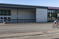 A cyclist rides through the streets of Toronto, passing by an empty building. The modern architecture and clear sky create a vibrant urban landscape. The city comes alive with the bustling energy of business and city life.
