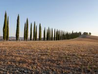 row of cypress trees lined up near a road in the countryside of tuscany, italy