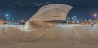 A modern architecture marvel in the heart of Dallas. This elevated skateboard ramp offers a straight down the road experience. The cityscape comes alive at night with the glow of street lights and the dark silhouette of office buildings.