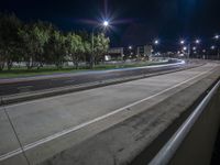 A dark city street illuminated by street lights and headlamps. Concrete road surface reflects the elevated lights. Clear sky casts a high contrast on the urban design.