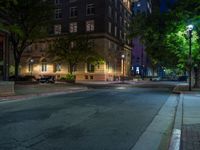 a city street at night with parking meters on either side and the road in the center