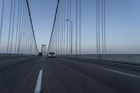 This is an image of a cable-stayed bridge at dawn. The blue sky and clear horizon create a beautiful backdrop for the bridge. The road surface is made of asphalt and the lanes are lined with motion blur. The bridge is an example of modern architecture and is an important piece of infrastructure. It is part of a highway and serves as a fixed link for transportation. The image captures the peacefulness of the early morning with the break of day.