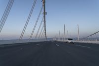 This image captures the break of day with a clear sky as the backdrop. The asphalt road stretches out in a straight line, disappearing into the horizon. The motion blur effect adds a sense of movement, suggesting the start of a new day. The bridge, with its suspension cables and lane markings, is an impressive piece of infrastructure. It serves as a vital connection point for various modes of transport. This photograph encapsulates the beauty of a fresh morning, promising the opportunities and adventures that lie ahead.
