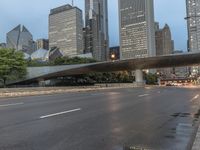 Evening view of a city street in Chicago, Illinois. The road surface is wet, reflecting the city lights. Skyscrapers and high-rises form the city skyline, creating a stunning urban cityscape.