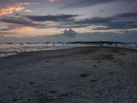 A serene coastal landscape at dawn. The golden horizon meets the calm ocean, with the beach covered in sand and gravel. Nature and recreation come together in this tranquil seaside scene.