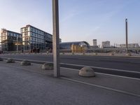 A clear dawn sky reveals the modern architecture of Berlin, Germany. Busy city streets are lined with tall buildings and a bridge. The urban design showcases the city's vibrant energy and European charm.