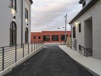 A classic suburban neighborhood at dawn. Straight down the road, with residential buildings and windows. The road surface, asphalt and flooring blend seamlessly. Street lights and the warm glow of artificial light illuminate the scene.