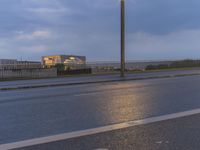 This image showcases the vibrant cityscape of Berlin, Germany. The modern architecture and urban infrastructure are illuminated by the artificial lights of the business district. The reflection of the city lights and wet road surface create a captivating scene. The motion blur of vehicles and light streaks adds a sense of energy and movement to the image. A tree-lined road with guard rails leads the viewer's gaze through the scene. Whether it is a dawn or night scene, this photo captures the essence of Berlin's bustling city life.