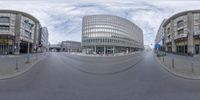A snapshot of a bustling cityscape at dawn. The fisheye lens captures the straight road and the mix of architectural facades. The person on the motorcycle adds a sense of movement and human activity.