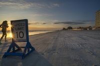 This stunning stock photo captures the beauty of a dawn coastal landscape at Daytona Beach, Florida. The image showcases the sandy beach and crystal clear water, with a straight road leading towards the horizon. The sky is painted with vibrant colors as the sun rises, casting a warm sunlight across the scene. In the distance, you can see the Daytona Beach race track, a popular destination for recreational activities. The natural environment of this seafront location offers a serene and picturesque setting for a relaxing day at the beach. The combination of the coastal elements, such as the sand, water, and the open space, blends perfectly with the surrounding trees and buildings, creating a captivating atmosphere. With a clear sky and the sun visible, this photo epitomizes the beauty and tranquility of Daytona Beach.